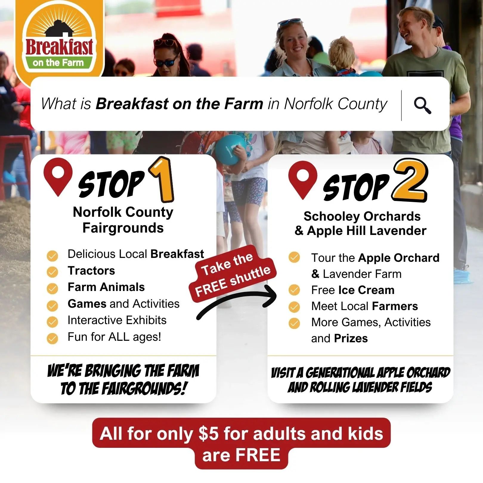 ๐ฅ Breakfast On The Farm | Simcoe Fairgrounds and Schooley Orchards/Apple Hill Lavender | 9am - 2pm | Farm fresh breakfast, exhibits, and farm tour | More