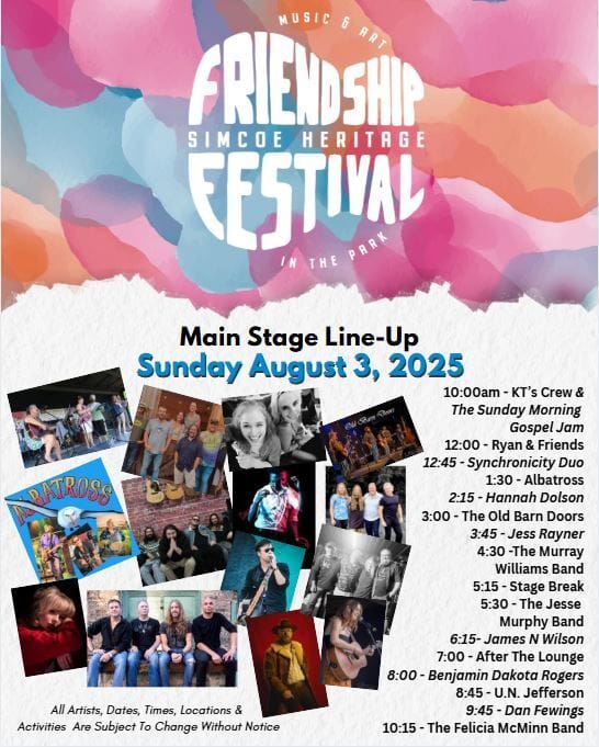 The Simcoe Heritage Music & Art Friendship Festival is rolling into downtown Simcoe this Civic Holiday weekend — and it’s bringing the energy! 🎶🎨🍔